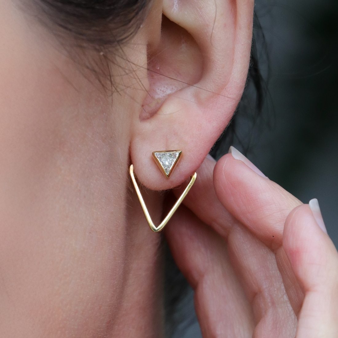 The second component is an open triangle earring jacket that can be worn behind the stud or behind the earlobe, allowing you to switch between a minimalist stud look and a bold geometric statement. This versatile design brings playful elegance to any jewelry collection.